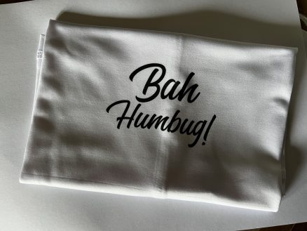 Perfect for frosty mornings and winter walks, this stretchy tube-shaped scarf is printed on the front with the text ‘Bah Humbug!’.